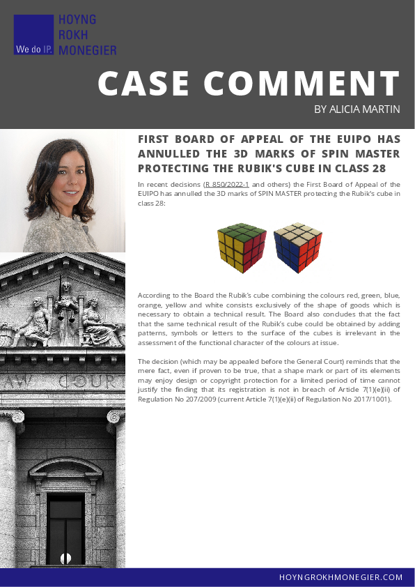 In recent decisions (R 850/2022-1 and others) the First Board of Appeal of the EUIPO has annulled the 3D marks of SPIN MASTER protecting the Rubik's cube in class 28: